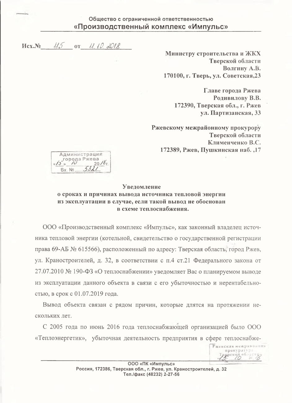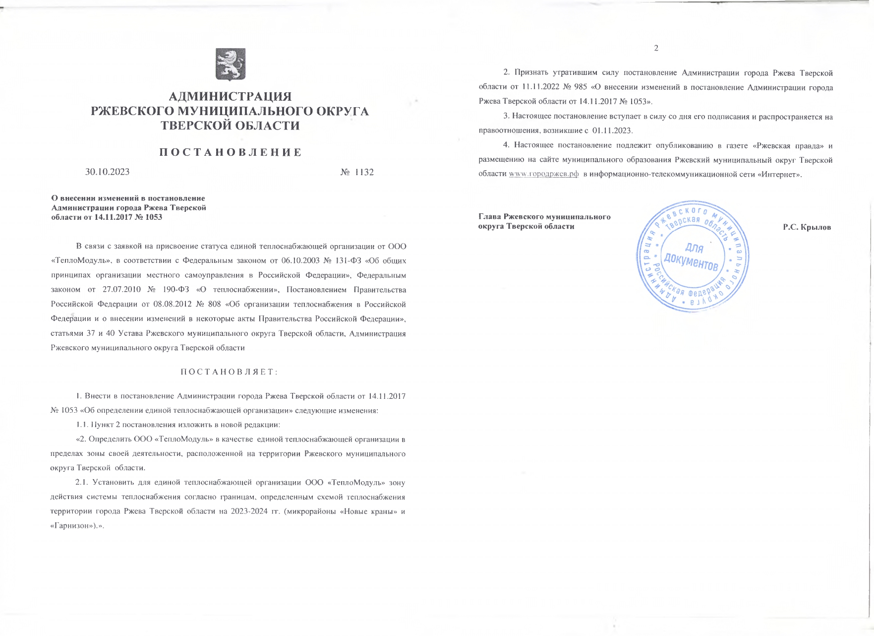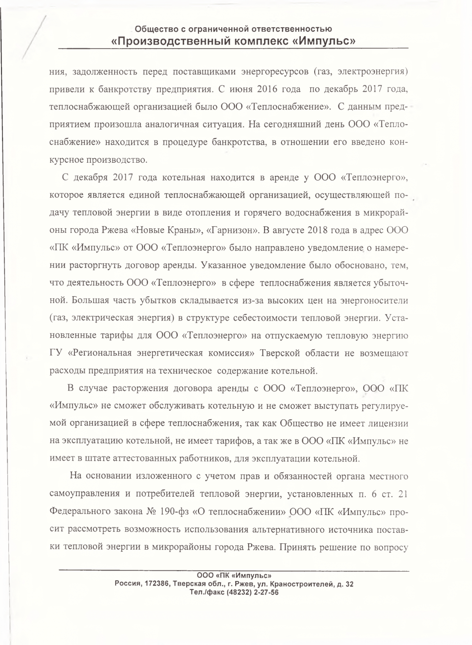 На основании договора аренды имущественного комплекса котельной, расположенной по адресу: М.О. Ржевский, г. Ржев, ул. Краностроителей, д.32 с 1 ноября 2023 года теплоснабжающей организацией является ООО "ТЕПЛОМОДУЛЬ", которая осуществляет подачу тепловой энергии в жилые микрорайоны "Новые Краны" и "Гарнизон" и обьекты социальной инфраструктуры этих районов.