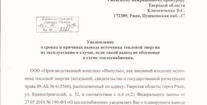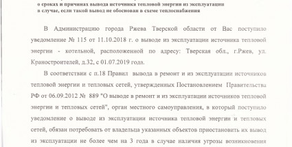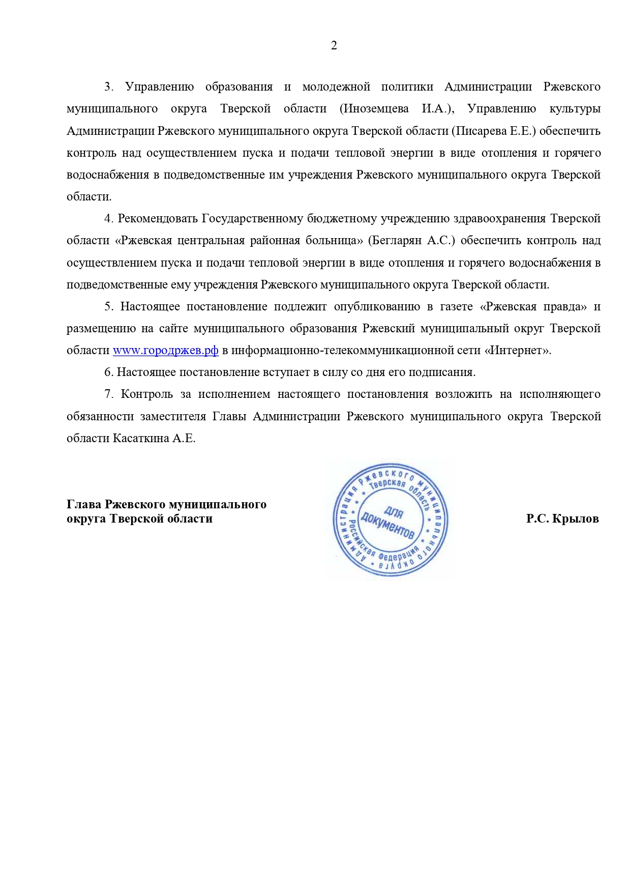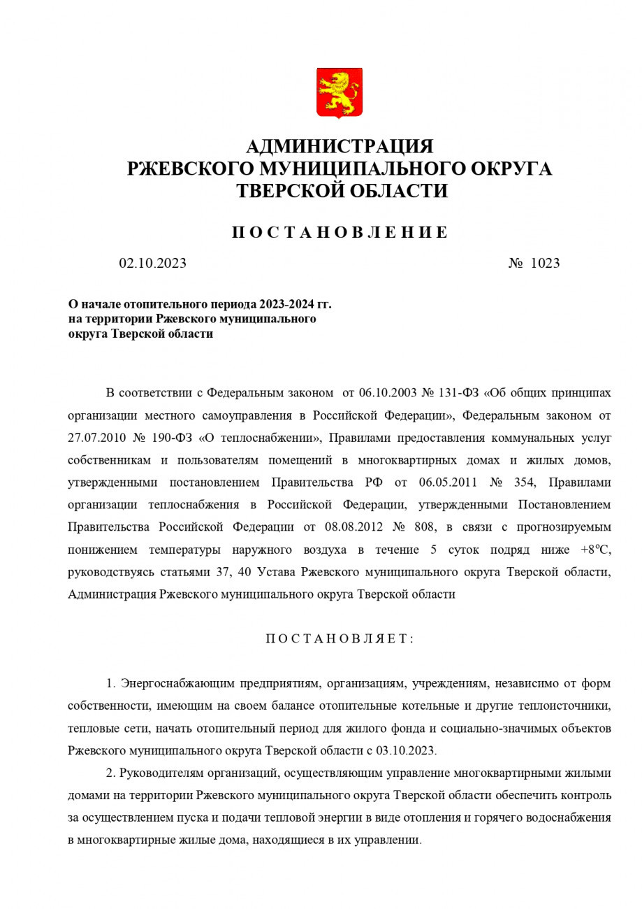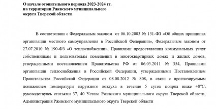 Постановление о начале отопительного периода 2023-2024 гг. на социально-значимых объектах города Ржева